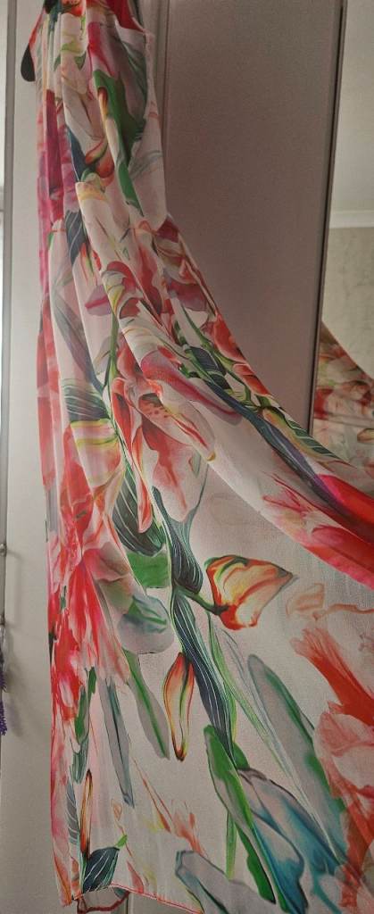 Ladies chiffon dress, size 14, pink floral, worn once, lovely on, very good condition, £20