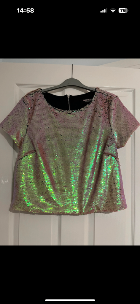 Sequinned top by Samantha Fairers. Generous size 10 box style. Worn once. Iridescent gold/nude sequins can form different patterns by using fingers. Smoke and pet free home.