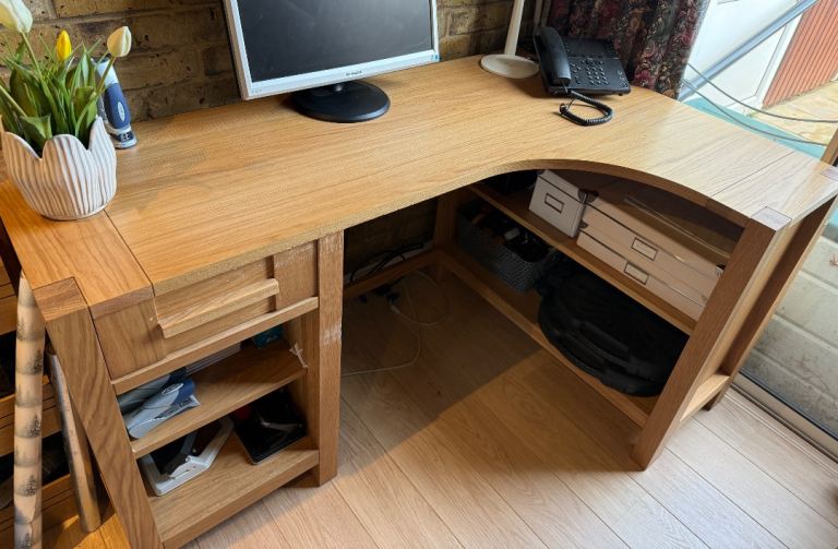 Office desk Width 150cm Height 77cm Depth 95cm at deepest point, 50cm the rest Slight wear from chair - see picture 4. Chair can be included for extra £20.00. Collection only.
