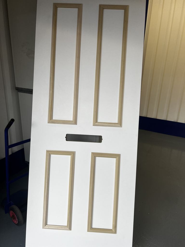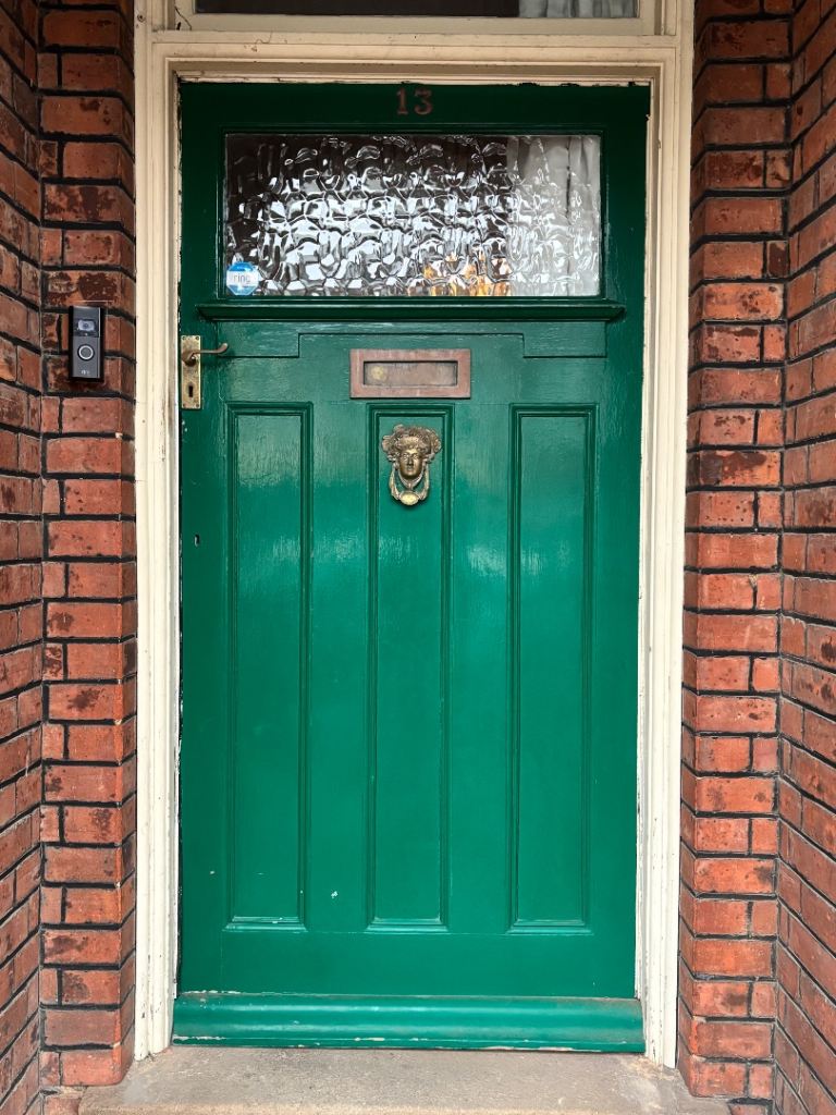 Beautiful original Victorian terrace front door, removed during renovation. Solid, heavy timber with classic period detailing. Painted green externally (white internally) with original frosted/textured glass panel, letterbox, and decorative door k