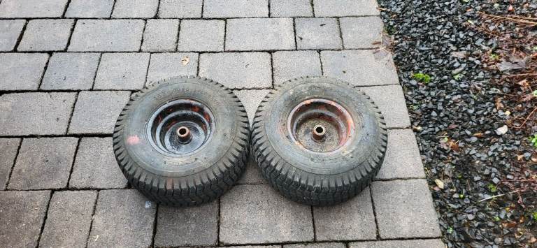 They are two front tyres off of a Countax ride on lawn mower they are size 15x6.00-6