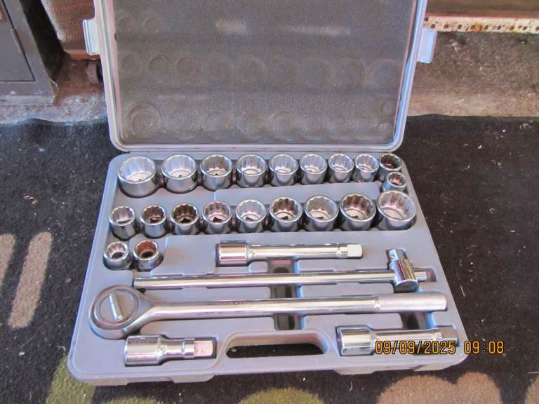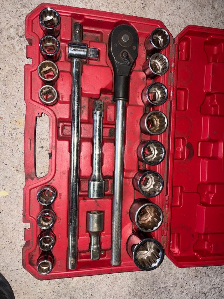 Neilsen 3/4" drive socket set in good used condition. Heavy duty set ideal for larger mechanical work such as suspension, hubs, trucks or machinery. Includes large sockets, ratchet, extension bar and breaker bar in the original case. All tools