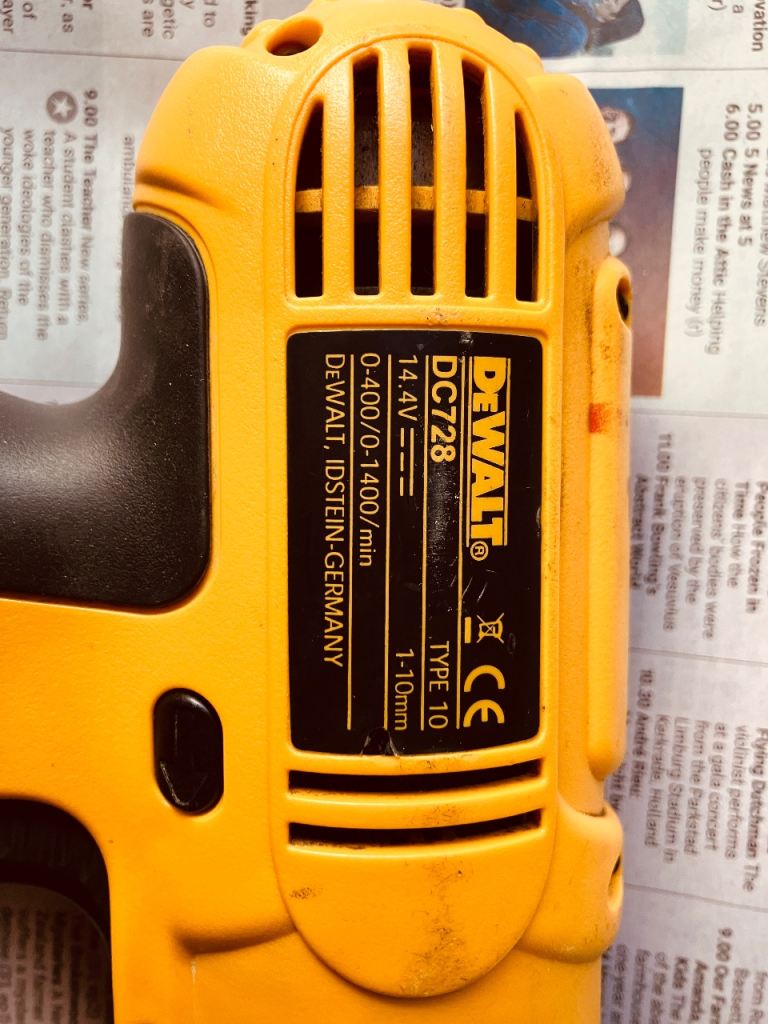 Used DeWalt DC728 no longer needed. Signs of wear and tear and a sticky (but working) direction lever. 1400rpm max speed taking 1-10mm bits. Perfect for the odd DIY job. Comes with case, charger and three batteries.