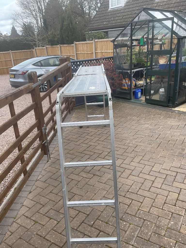 Combinaion ladder with platform, comprising step ladder, leaning ladder and stand off ladder.