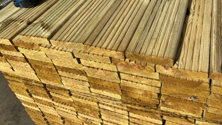 Brand new Timber pressure treated Decking 4.8mtrs long 125mm x 32mm ( finished size 119mm x 27mm ) £11 per length collection Tamworth or delivery available locally for fuel