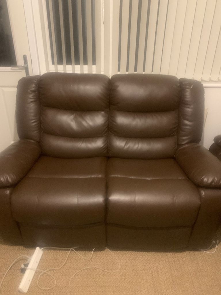 3 /2 seater bonded leather sofas Manual recliner Good Condition Some paint stains Minor scratches etc Free