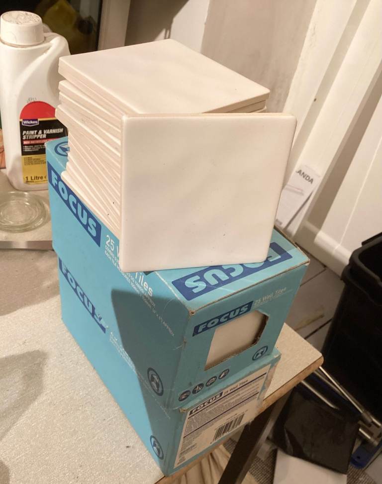 Updated 24/02/26 White bathroom tiles ( approx 60) bought from B&Q years ago. 10cms x 10cms square. Slight ripple or dimple effect on gloss surface. Available from Blaenavon. These are wrapped in plastic on the green bin outside 8 maxworthy Row (The