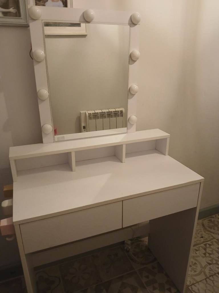 FREE *LIGHTS NOT WORKING White vanity table with a mirror. It's in good used condition with two drawers for storage. It had a few makeup stains that should come off with a more thorough clean. May be best suited to teen bedroom/ student flat. Coll