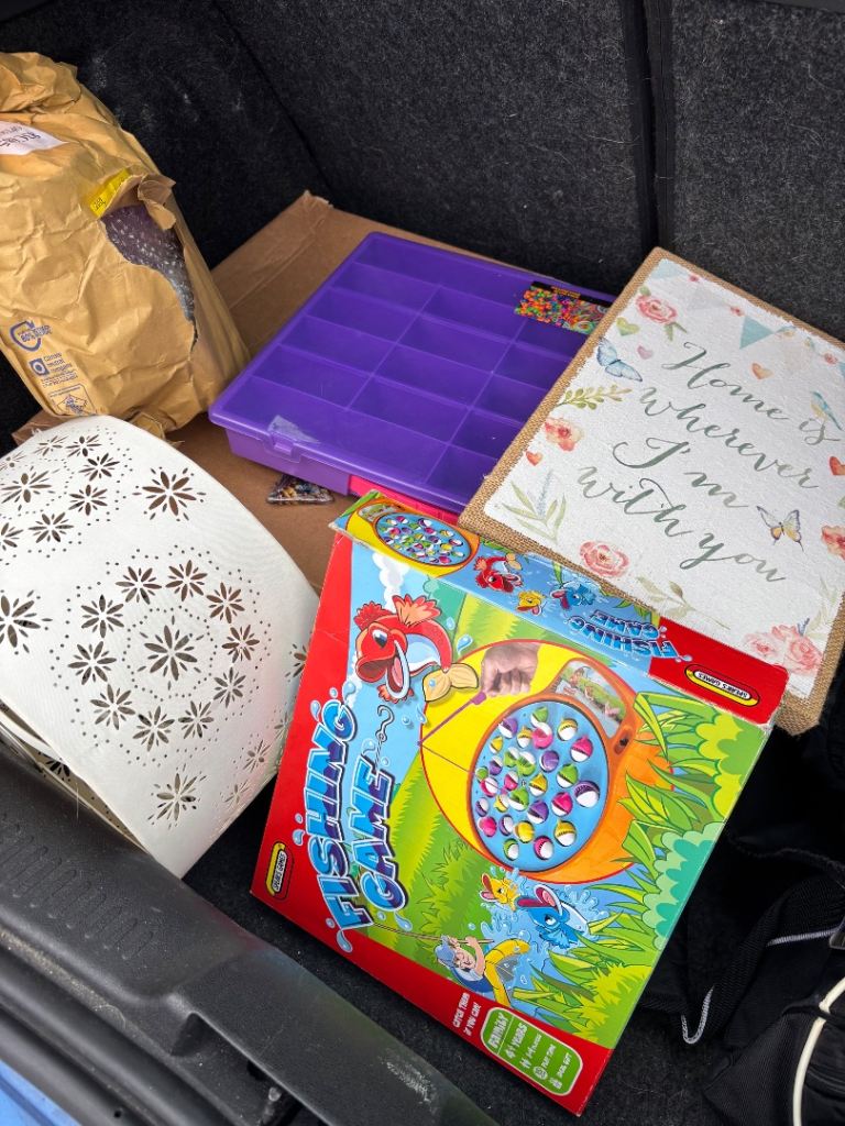 Heeled shoes size 3 mugs fairy lights , rope necklaces Russians dolls lampshade and game and a few other bits
