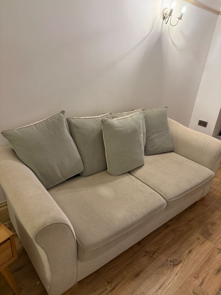 *FREE* 3-4 person scatter back sofa. Approx measurements - 210cm (L) x 85cm (W) x 70cm (H) 5 cushions on the back can either be pale green or turned to be beige. This is used and will definitely need cleaning (I have done my best to photo