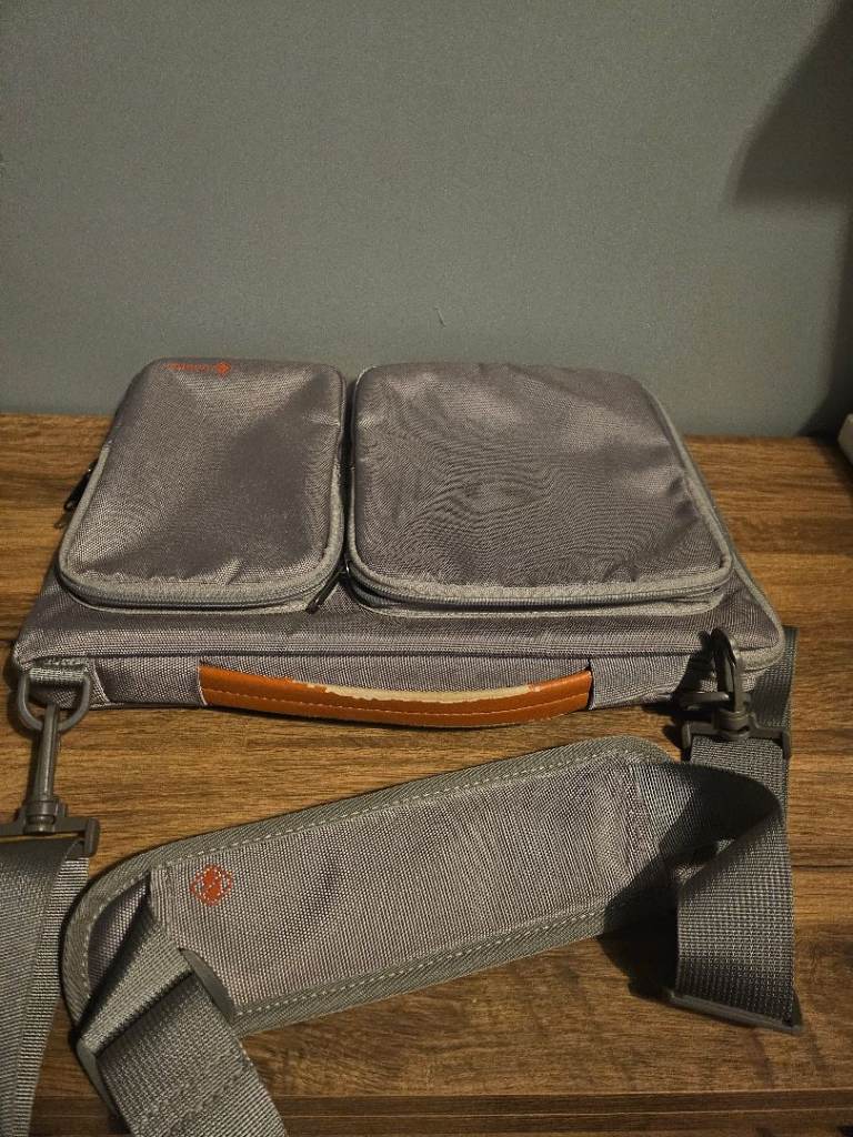 14" laptop bag with 2 side pockets and shoulder strap The top handle is damaged and the coating has peeled away, the rest of the bag is undamaged Free for collection