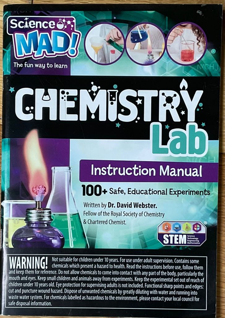 Chemistry Lab Set with manual Ages 10+ (adult supervision) All apparatus in New condition Comes with chemicals (see photos for list) so requires care, common sense Comes with safety glasses Please note that it is missing filter papers and stirri