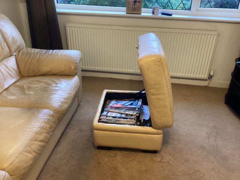 Large cream leather settee, there are no rips or tears in the leather, it has marks as shown on the photo which may clean off , but would be perfect with a throw on it. The footstool has cup marks on the top which also may clean off, it doubles a a