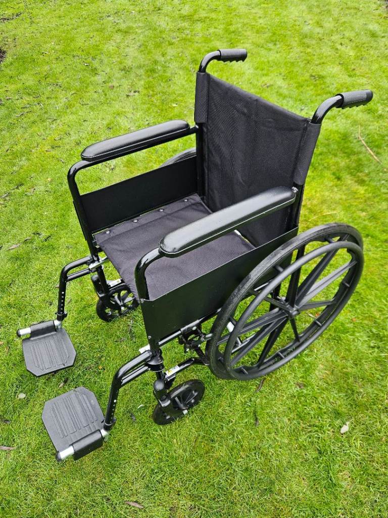 Sturdy steel framed folding self-propelled wheelchair. Detachable foot rests. Used.