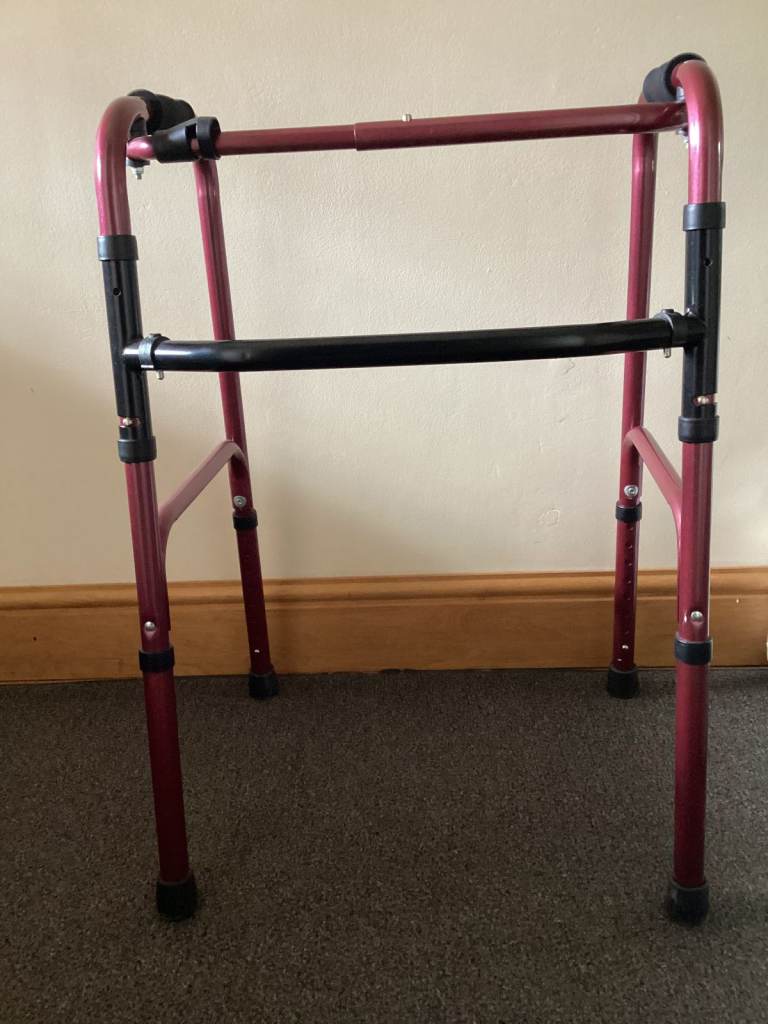 Lightweight Foldable Burgundy Walking Frame. Height is adjustable. In very good clean condition. Rarely used. £15, buyer collects ONLY!