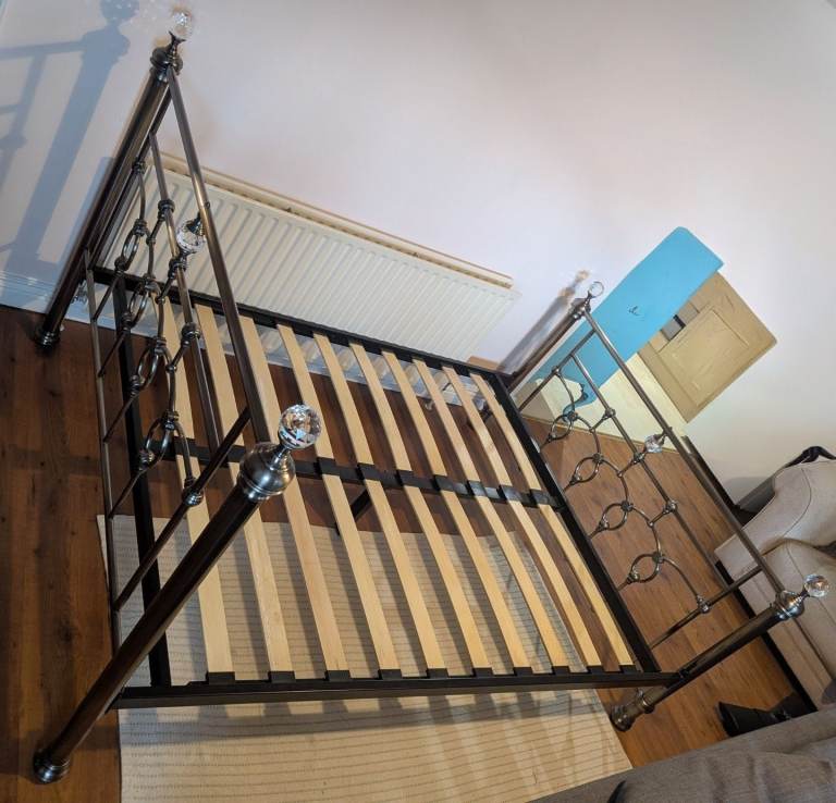 A high-quality traditional style metal bed frame, fitting a double mattress. Includes a high headboard and matching footboard, which are both finished in tastefully shiny chrome. They are enhanced with crystal-style prism filials and highly detail