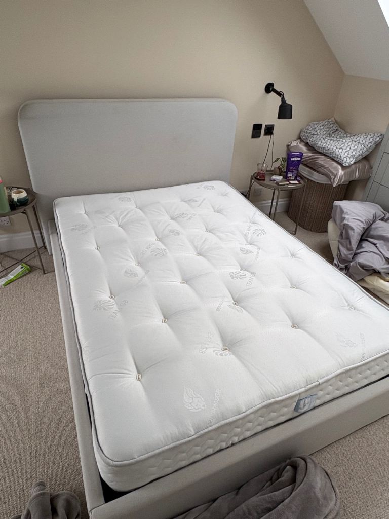 Cream/Grey Ottoman Bed and Dreams Mattress both just under 2 years old. Great storage underneath and assembles really easily. No marks on the mattress, have used a mattress topper the entire time and was only bought in May 2026. Only selling as movi