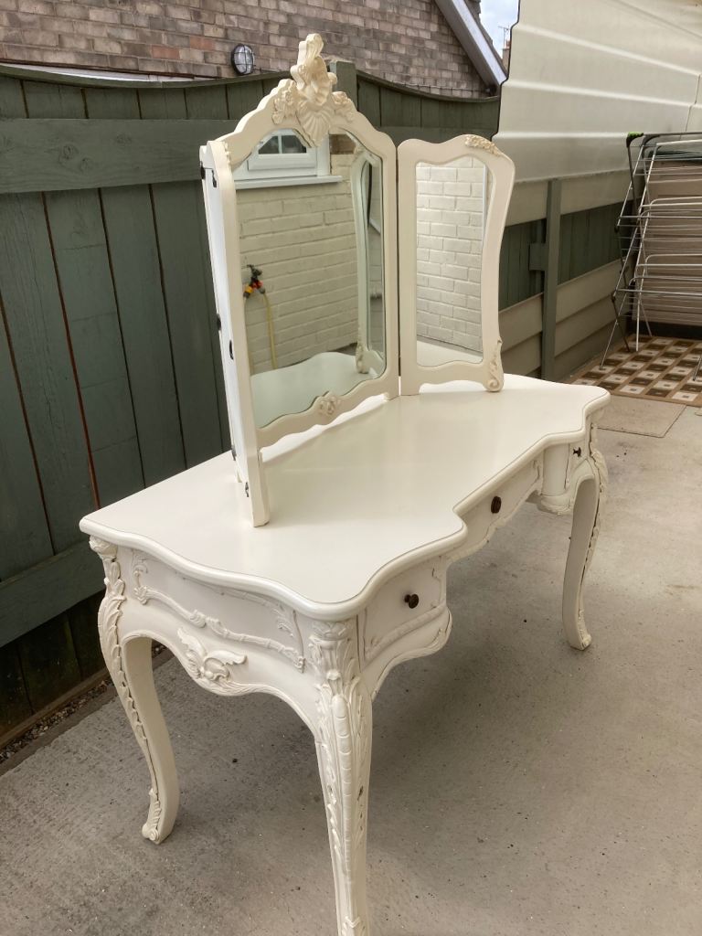 A very nice-looking dressing table in an ornamental French style with a matching comfortable stool. The three-section mirror is freestanding and can adjusted for any view. There are three drawers for storing all those bits needed for the lady’s (or
