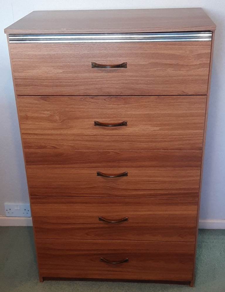 Chest of drawers - 5 drawer Brown wood effect Very good used condition (See photos for condition) Approx sizes: Width 72cm x Depth 44cm x Height 115cm From a pet & smoke free home. Collection from St Johns, Worcester, WR2 5.