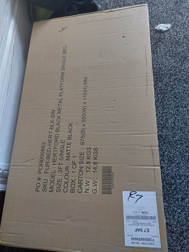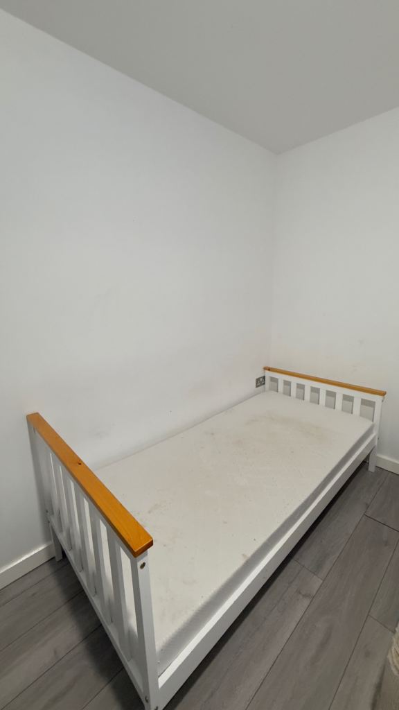 Selling a used bed frame with mattress. White wooden frame with light wood trim – sturdy and simple design. Ideal for toddlers or young children transitioning from a cot. Mattress included (shows signs of use). Overall condition: frame is solid,