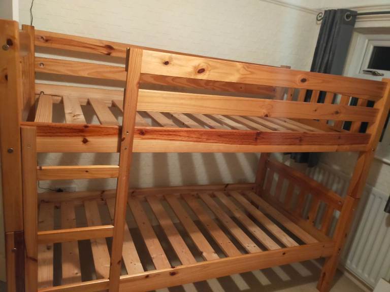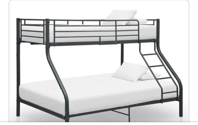 Metal bunk beds. Partly assembled. Upper and lower base are fixed so will need a large estate/van. Silver