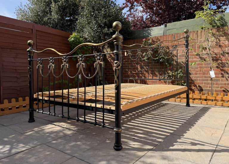 This stunning and elegantly romantic And So To Bed cast Iron / Metal & Brass King Size bed-frame is in a great condition overall, Bed comes with brand new ASTB slatted system bases. Brass was gently hand polished using brasco. Frame was cleaned. Ther