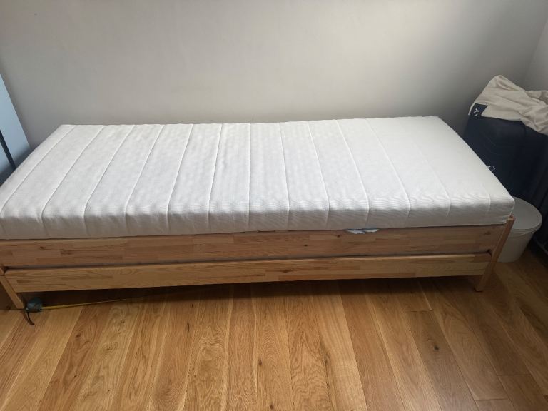 Stackable single beds that make a really comfortable double or 2 x singles. Being sold with mattresses, duvet and covers. For dimensions / information please look up the Ikea UTÅKER in pine. Price negotiable. Pick up E17