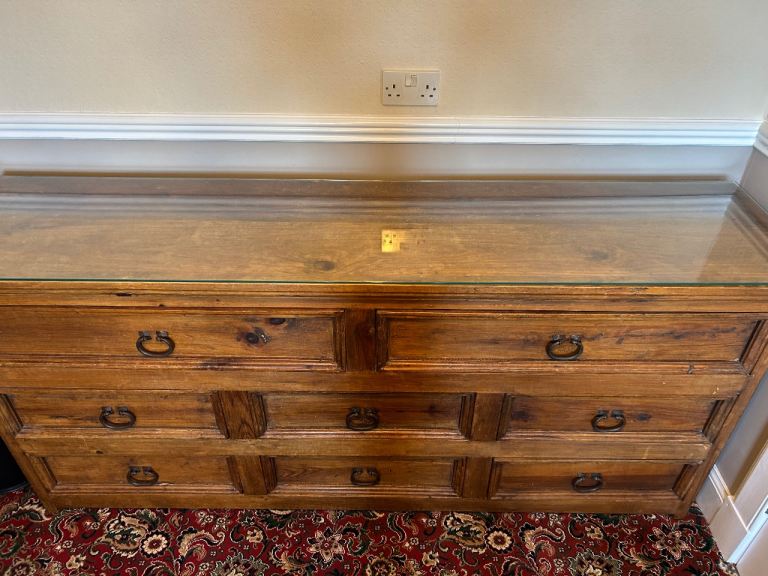 Two solid oak glass top chest of drawers. 6 x 2 drawers length 79” D 18” H 35” £250 3 x 2 drawer’s W 30” D 21” H 35” £150 Can deliver.