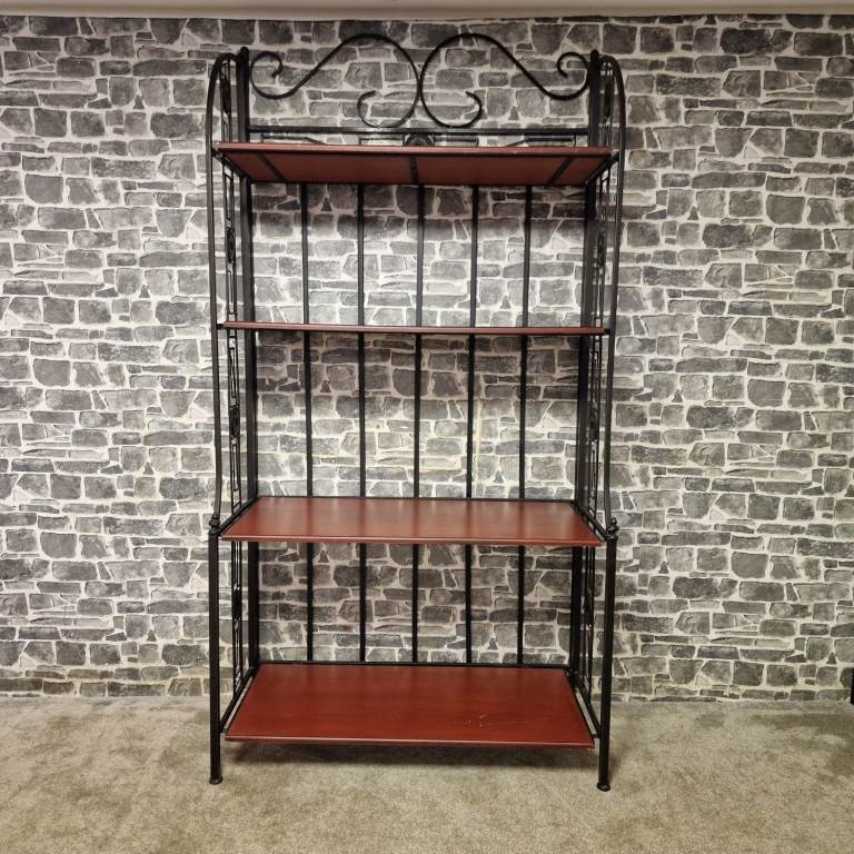 Stylish folding shelving unit with a black wrought iron-style frame and four cherry-toned wooden shelves. Features decorative scrollwork and geometric side detailing. A few minor surface scuffs on the shelves, but overall in good, sturdy condition. F