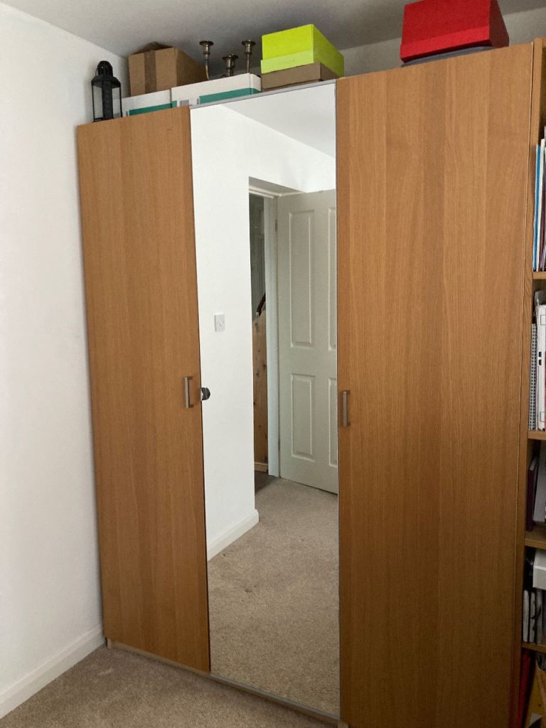 One double wardrobe with shelf below hanging space Currently one mirror door and one in oak veneer. One single wardrobe with oak veneer door Can be swapped with one from double wardrobe. Single wardrobe has shelf above and below hanging space. Do