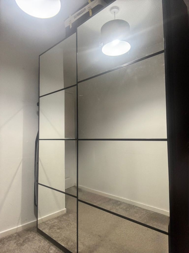Double pax wardrobe with glass sliding doors. Bought from IKEA 2 years ago, still like new only selling due to having a baby and needing more space. Dimensions; Width - 150cm Height - 200cm Depth - 45cm