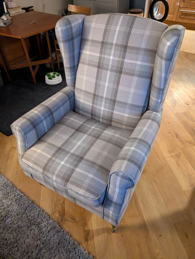 Barely used wingback Oswald armchair from Dunelm. Has had grey cover on it since purchased (pictured). Can give you the cover if you'd like. Sat on a handful of times. Gorgeous grey and white tartan. Casters on front two legs make it really e