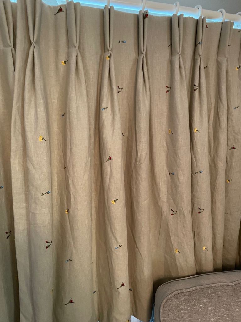 2 pairs, pure linen, interlined and blackout, double pleat curtains. Professionally, expertly bespoke made, very expensive when made and hardly used. Natural linen colour with tiny embroidered flower buds. Each curtain measures approximately 124 cm f