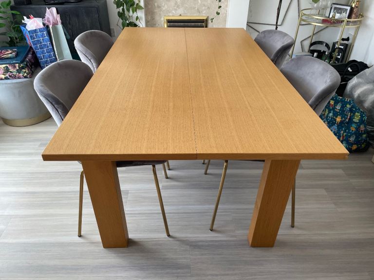 Habitat light walnut wooden dining table Extending table , no dining chairs included. Approx measirements- Normal size- L-160cm, W-90cm, H-75cm Extended size-L-160cm, W-136cm, H-75cm Some scuffs and marls(see last 3 images) also minimal sun exposu