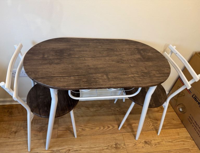 White gloss finish dining table. Seats 4 comfortably Legs are metal but look like wood. Legs have been removed for easy removal VGC 120cm x 75cm