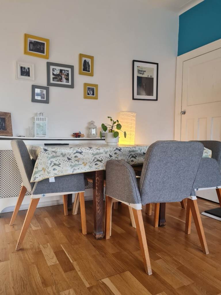 EXCELLENT CONDITION Dining table with 4 chairs Table L120 x W80 x H75 Chair padded seat D43, W48, H43 Collection only (Lamp not included)