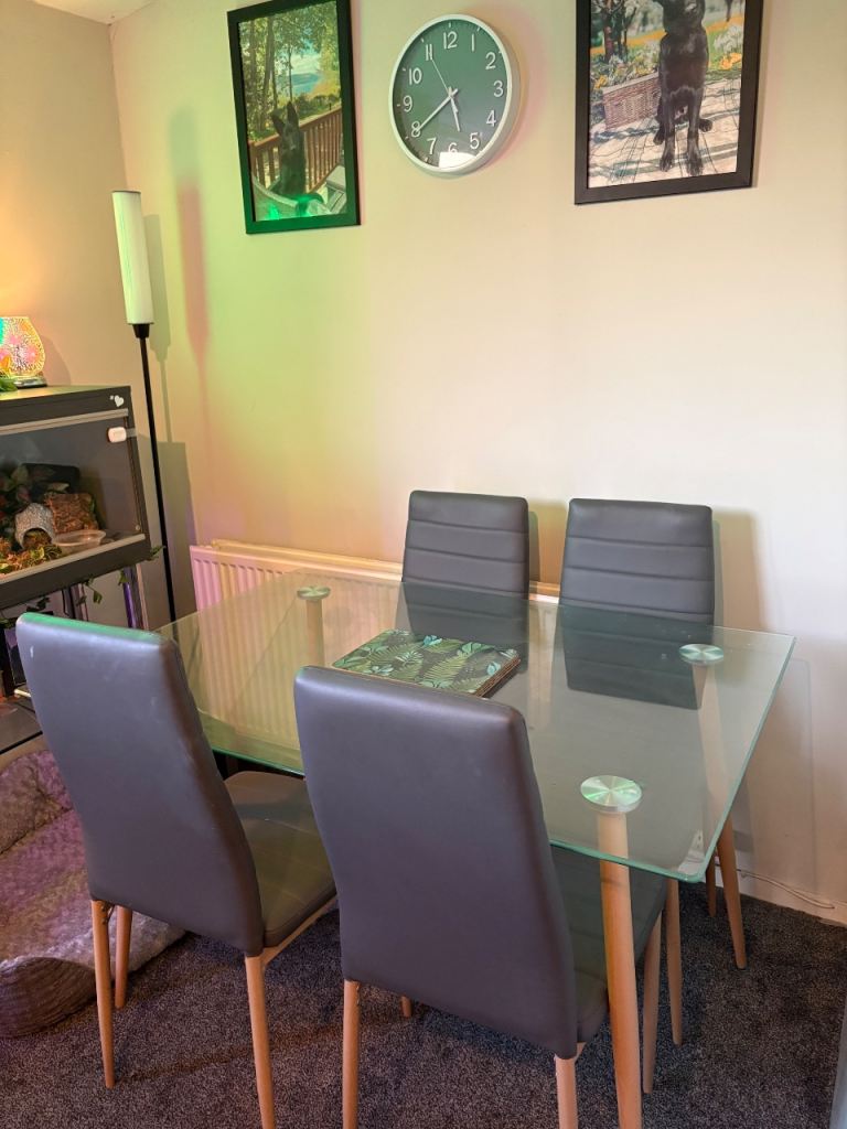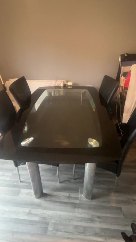 Need real d of this dining set as it takes up too much room and is barley used. Full glass top , wooden legs and 4 grey leather chairs. Glass has a couple scuffs but nothing major and one chair has some paint. Collection only and I would recommend 2