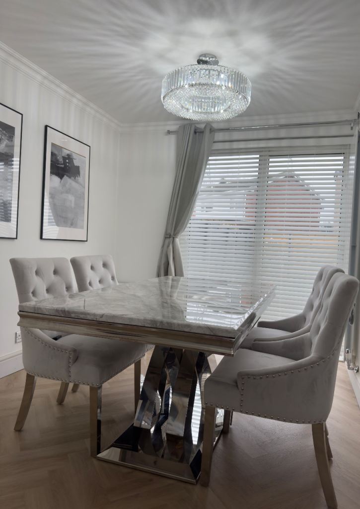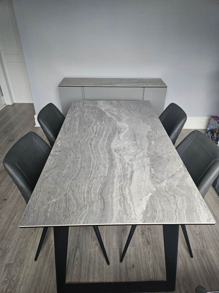 DFS dining table and 4 chairs. Reason for sale is that it isn't used often and is to big for the space I have. Bought in 2021 brand new from DFS. Very good condition a few chips on the back of a couple of chair legs as shown in pictures, slight scuf