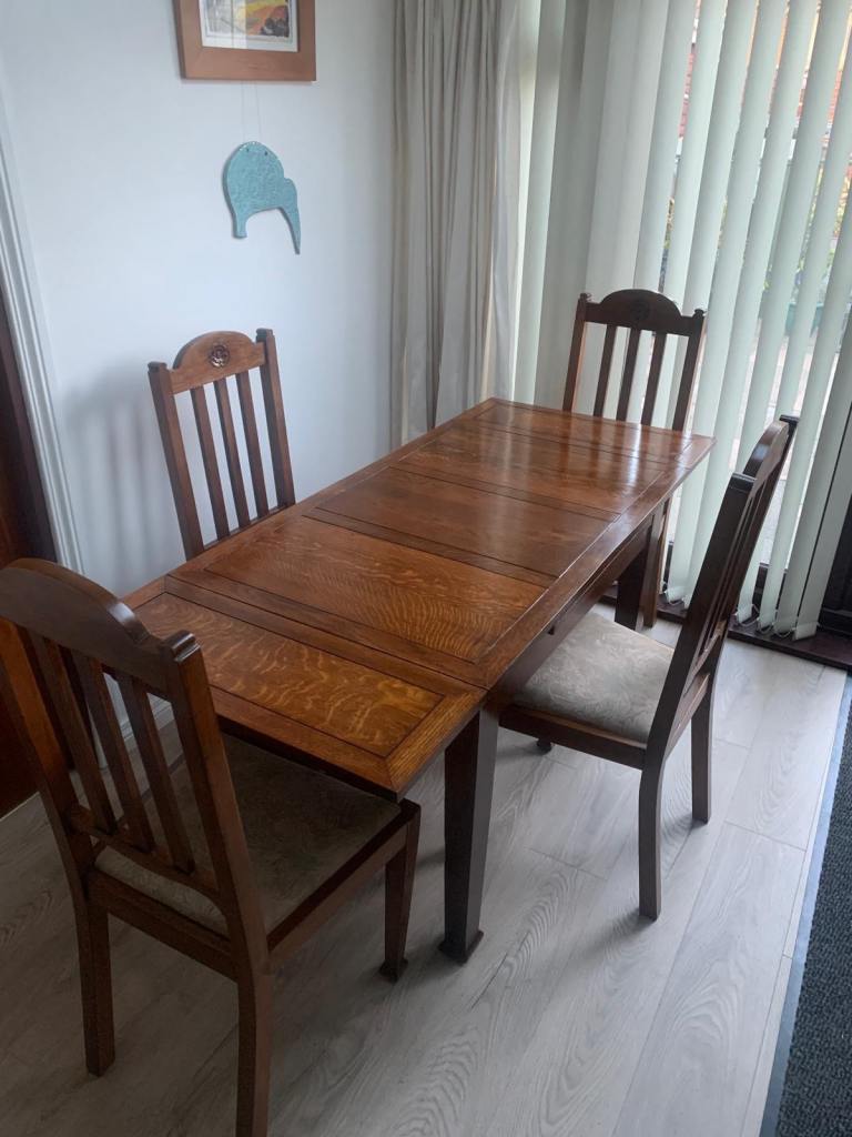 Antique mahogany dining table and 4 matching chairs. Table is extendable 71.5cm wide 112.5 cm length 166.5 cm fully extended 75.0 cm height