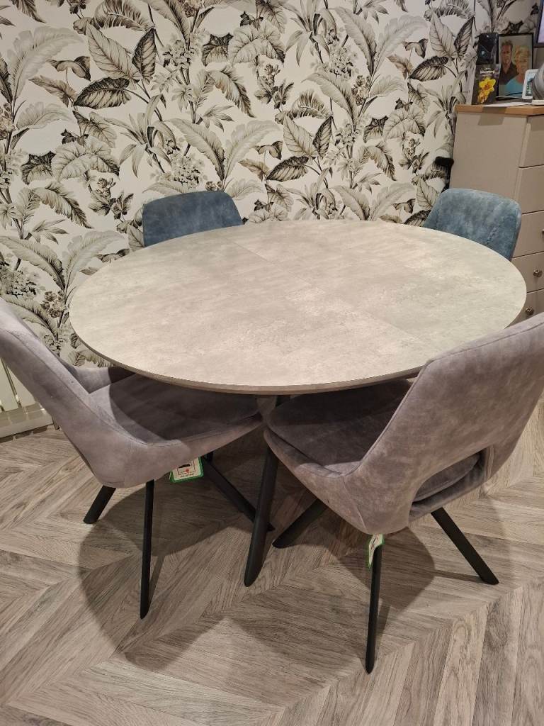 Dining Table - Beautiful Round 120cm, extending to 160cm by 120cm Oval. Light Grey matled effect top. Very resilient and neat. Height 76cm. Black legs. Very good condition. Originally purchased from Gillies. Chair - Comfortable Swivel style with ma
