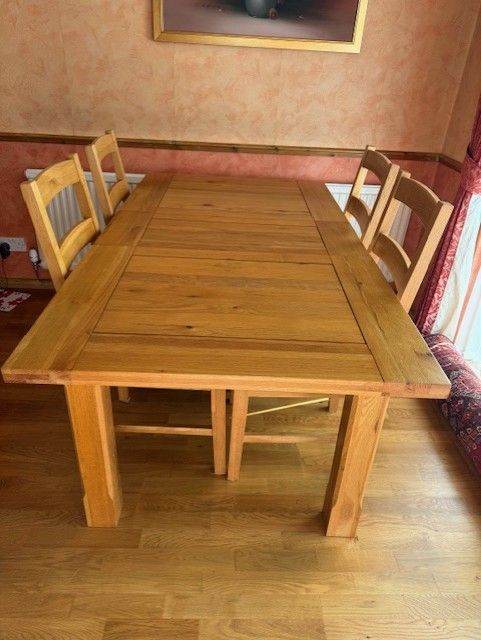 Solide Oak, with 4 matching chairs. Table extends to 8 place setting. Table excellent condition but chair upholstery slightly damaged.