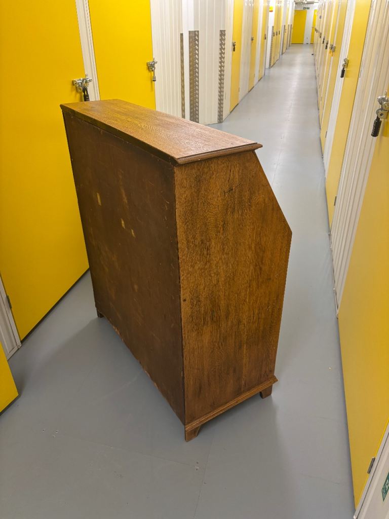 Lovely brown wooden bureau desk, perfect for a study or living room. Features a pull-down desk flap, a drawer, and a two-door cupboard with a shelf. Signs of use typical for its age. front doors don't close properly and so would require some attent