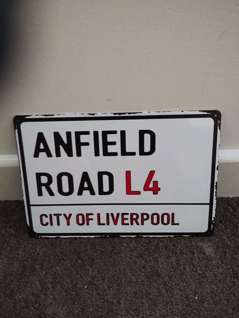Retro Anfield Road metal plaque white with black and red lettering 30 cm x 20 cm.