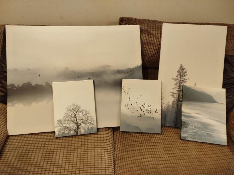 A set of scenic canvas prints from photography using the same theme. Large 82cm x 65cm tall, medium 38cm x 65cm tall, 3 x small 24cm x 32cm tall. £20 or near offer.