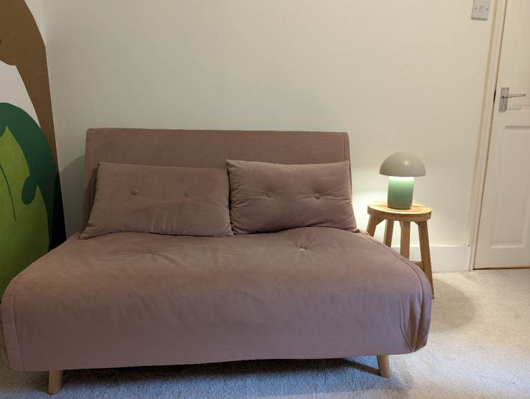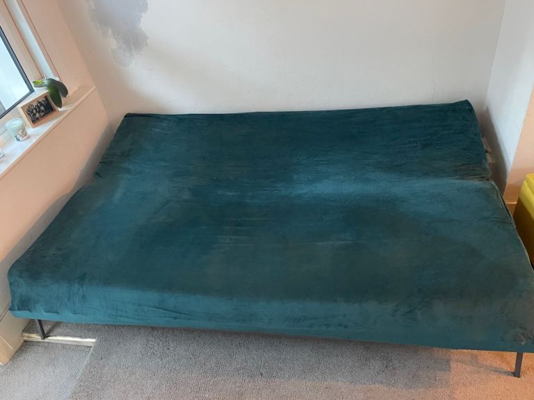 Futon sofa bed in green, 3 years old and in excellent condition. Measurements are shown in the picture. Includes a green velvet cover. Cushions are also available for sale separately, depending on price.