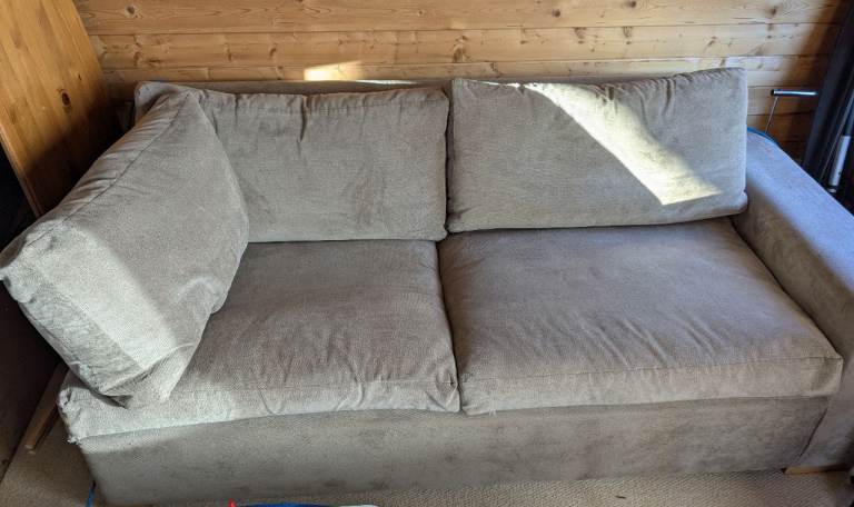 Sofabed - Free, but must be collected from CO9 4EG Grey/Tan colour Custom made to fit against wall on right side Small double bed size In good condition - except to for damage to 1 cushion corner (see picture)