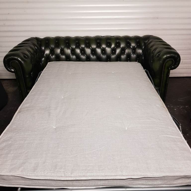 NEAR PERFECT GREEN Leather Chesterfield SOFA BED 3 Seater Sofa Couch Settee -FAB A beautiful, very well made chesterfield SOFA BED. The frame of the sofa is solid and structurally sound. The bed mechanism is in perfect working order and very easy