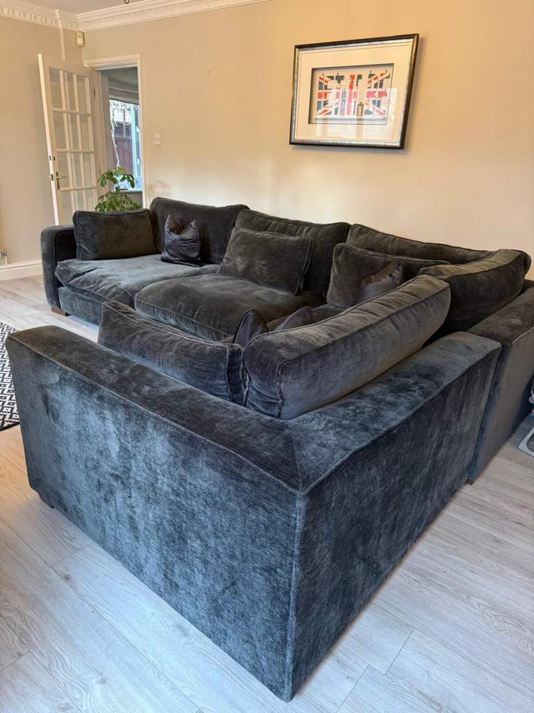 Large Sofology corner sofa in Blanik Slate fabric. Model: Cavalli Wooden – Encore (right-hand corner / asymmetric). We absolutely love this sofa and are so sorry to see it go. We are only selling it due to us remodelling the house. It is so com