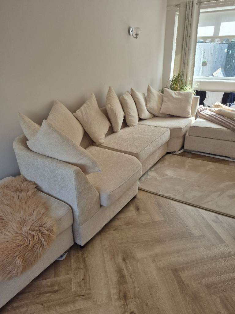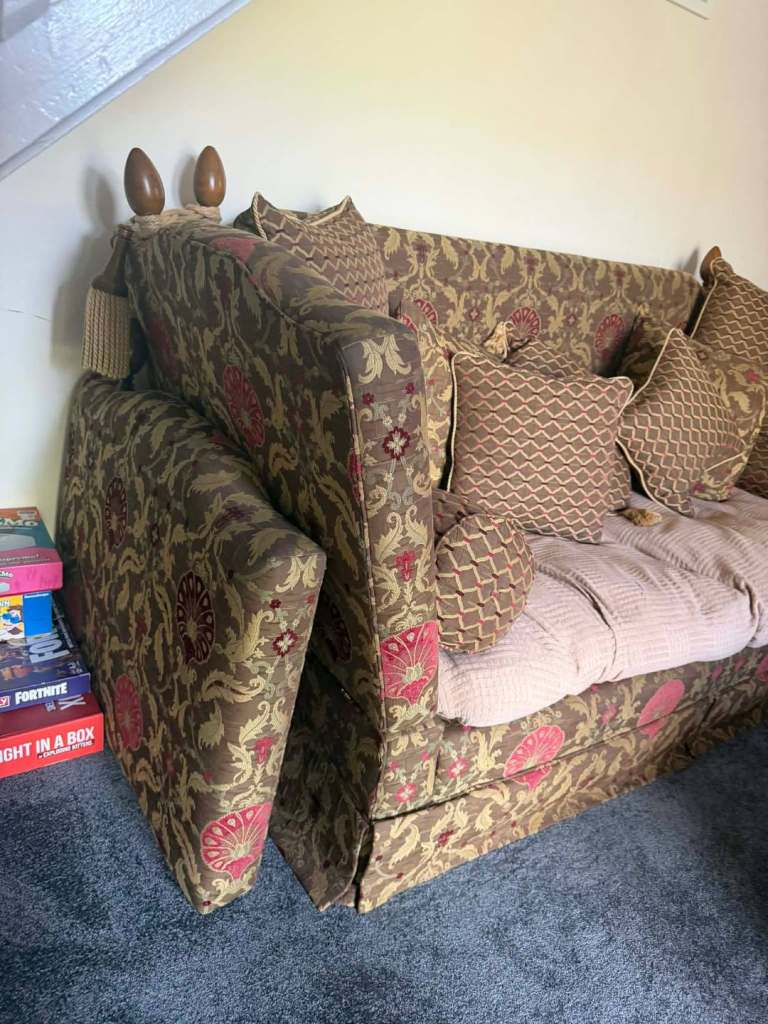 Lovely well used 2 4 seater sofas wanted 1000 for both but open to offers these still sell for atleast £2.500 each second hand no feet and missing a tassle of one of the cushions as pictured i have made this in to a corner couch but have the arm to g