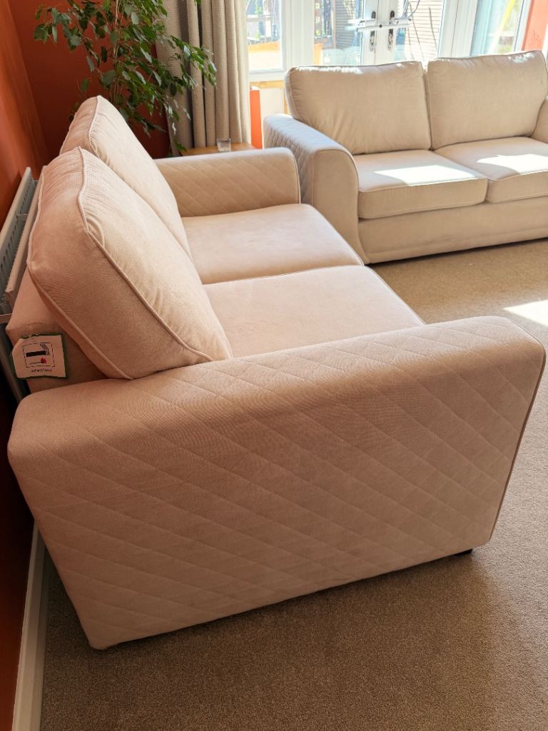 Pair of comfortable beige fabric sofas. Both sofas are in good condition. Will be cleaned with our vax before collection. Clean design with quilted arm detailing, ready for a new home. No major stains or tears, cushions are still firm and supportive